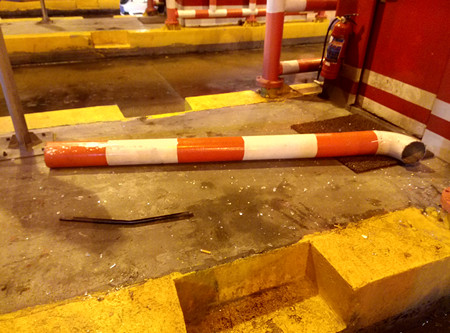 圖為被撞壞的收費崗亭 該車在臺州收費站下高速時,由于車身太長,司機沒察覺到車后半部分所載的傾斜的大米,出收費站時也沒有留意觀看后視鏡,導致傾斜的大米直接把五號收費亭防撞鋼管和收費亭邊窗玻璃撞壞,發(fā)出巨大響聲。收費班長陳幸聞聲后立刻跑到崗亭察看,五號車道右前方的防撞欄被撞斷,右側(cè)玻璃破碎,五號崗亭內(nèi)工作臺上、地面上全是玻璃碎渣,所幸當時崗亭內(nèi)無人在崗,沒有造成人員受傷。 陳幸一邊通知負責路產(chǎn)勘察賠償?shù)娜藛T到場,一邊協(xié)助司機先將傾斜的幾包貨物卸下,再將車移到外廣場,以免堵住車道,影響四號車道正常通行。最后經(jīng)勘察定損,司機按規(guī)定賠償了500元。 在此,筆者提醒廣大司機朋友,過收費站時一定要慢行,注意四周的收費設(shè)施,并及時檢查所載貨物有無歪斜,既保證自己及他人的安全,也減少不必要的損失。 余娟娟
