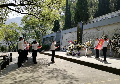 圖為敬獻鮮花 九峰烈士陵園始建于1956年,埋葬著20世紀50年代為國捐軀的120余位革命先烈。墓區內青松翠柏環繞,墓前豎有一座“革命烈士永垂不朽”的石碑。上午10時許,祭掃儀式開始,全體人員懷著無比崇敬的心情向革命先烈鞠躬默哀,緊接著依次走到紀念碑前敬獻鮮花,表達對革命先驅的悼念與緬懷之情。在紀念碑前,全體黨員重溫入黨誓詞“我志愿加入中國共產黨,擁護黨的綱領,遵守黨的章程......”