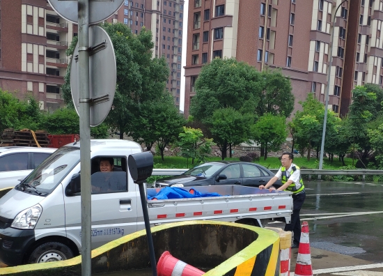 車輛故障拋錨 收費(fèi)員冒雨推行 7月4日中午12時(shí)30分左右,一輛牌照為浙開頭的五菱小貨車停在臺(tái)州收費(fèi)所出口5號(hào)車道安全島邊上許久未動(dòng),來往車輛紛紛避開該車道。當(dāng)班班長郭斯泓發(fā)現(xiàn)這一情況后立即上前詢問,并在該車后放置隔離桶,提醒駕駛員打開雙閃燈。