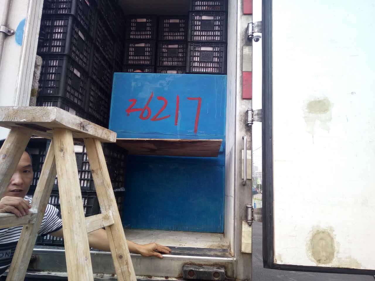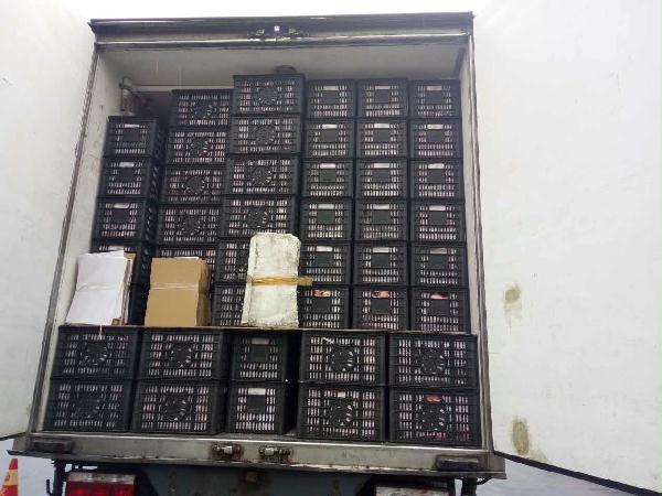 圖為被處罰的車輛 早上10點40分左右,這輛運蘋果的貨車駛?cè)胧召M站的一號崗?fù)ぃ緳C師傅說自己運的是蘋果,根據(jù)公司規(guī)定,綠農(nóng)車檢查必須開車門檢查貨物。憑著多年的檢查經(jīng)驗,當班班長童軍偉發(fā)現(xiàn)這輛綠農(nóng)車有問題,覺得重量遠遠不夠,可能不符合“綠農(nóng)”免費政策。果不其然,車廂中“深藏玄機”,左右兩側(cè)各有一排玻璃鋼魚箱,這就給檢查增加了難度。當班班長要求司機師傅把最后兩排箱子拿掉,想檢查玻璃魚缸,然而這個司機極其不配合,還惡意刁難工作人員,說什么也不搬蘋果。