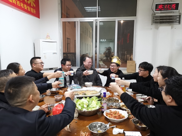生日快樂——我們是相親相愛的一家人 “祝你生日快樂,祝你生日快樂……” 1月30日傍晚,溫嶺西收費所二班成員齊聚 在單位食堂,為小壽星洪燈杰舉辦了一場簡單而又有意義的生日宴會。