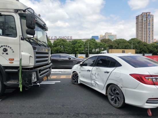 圖為事故現(xiàn)場 聽到巨響,收費(fèi)員立即上前查看,所幸兩車司機(jī)都安好,便立即開啟備用車道,以保證其他車輛通行順暢,并且在事故車輛后方放上小紅帽,告知后方來車及時駛?cè)肫渌嚨馈6鴥绍囁緳C(jī)快速撥打交警電話,并且拍照留證,以最快的速度駛出收費(fèi)站靠邊等待交警處理。 經(jīng)調(diào)取錄像,查看事故緣由。“真相”竟是集裝箱司機(jī)引發(fā)的,該車從杭州寧波方向過來,小轎車司機(jī)從溫州方向匝道駛出,由于集裝箱司機(jī)下橋時沒有注意右方來車,只顧自己右拐車道,直接頂著轎車開出50多米,所幸未造成人員傷亡。 在此小編提醒大家:在駛?cè)朐训赖臅r候,司機(jī)要減速行駛;在選擇出口車道的時候,要仔細(xì)查看前后方和左右來車,且不要突然變更車道,否則容易造成車輛之間的親密“接觸”。 只有文明安全行駛,才是對自己和他人最好的保護(hù)。 鄭霞霞