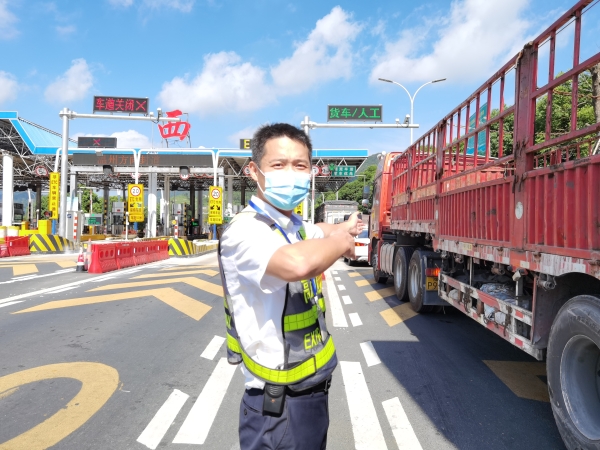 這是征費四班班長鄭星和駕駛員的對話,他手持iPad,不停地在屏幕上滑動著、查詢著。天氣炎熱,大貨車開車時較為顛簸,3M膠軟化黏不牢,ETC設備容易脫落。ETC設備一旦掉落,則會提示“標簽已失效”,就無法正常工作,不能實現不停車出入高速公路ETC車道,給來往司機和收費人員增添了很多麻煩。為全力配合ETC服務需要,鄭星冒著酷暑高溫,不厭其煩地幫著司乘人員解決問題,一天下來工作服濕了又干,干了又濕,他就是臺州高速上的最美堅守者。