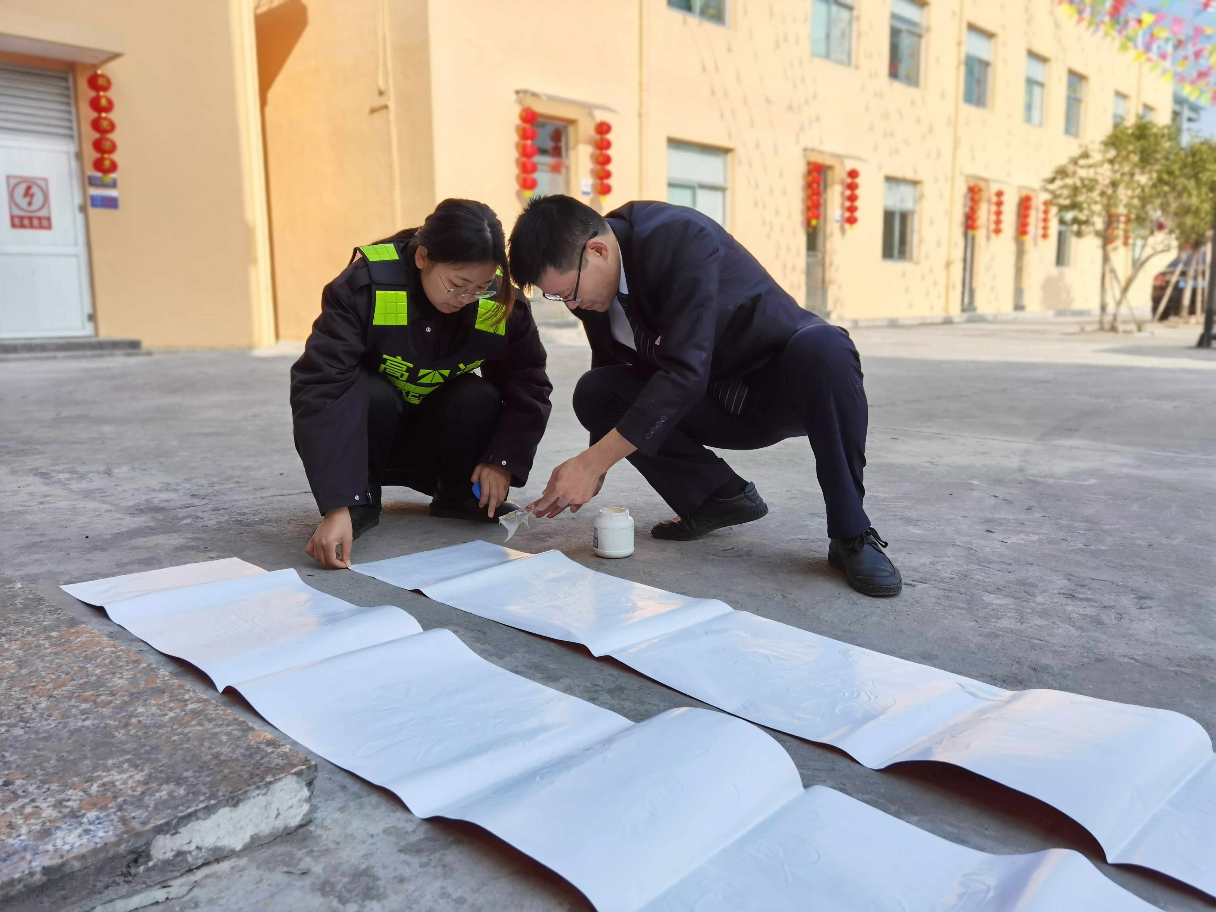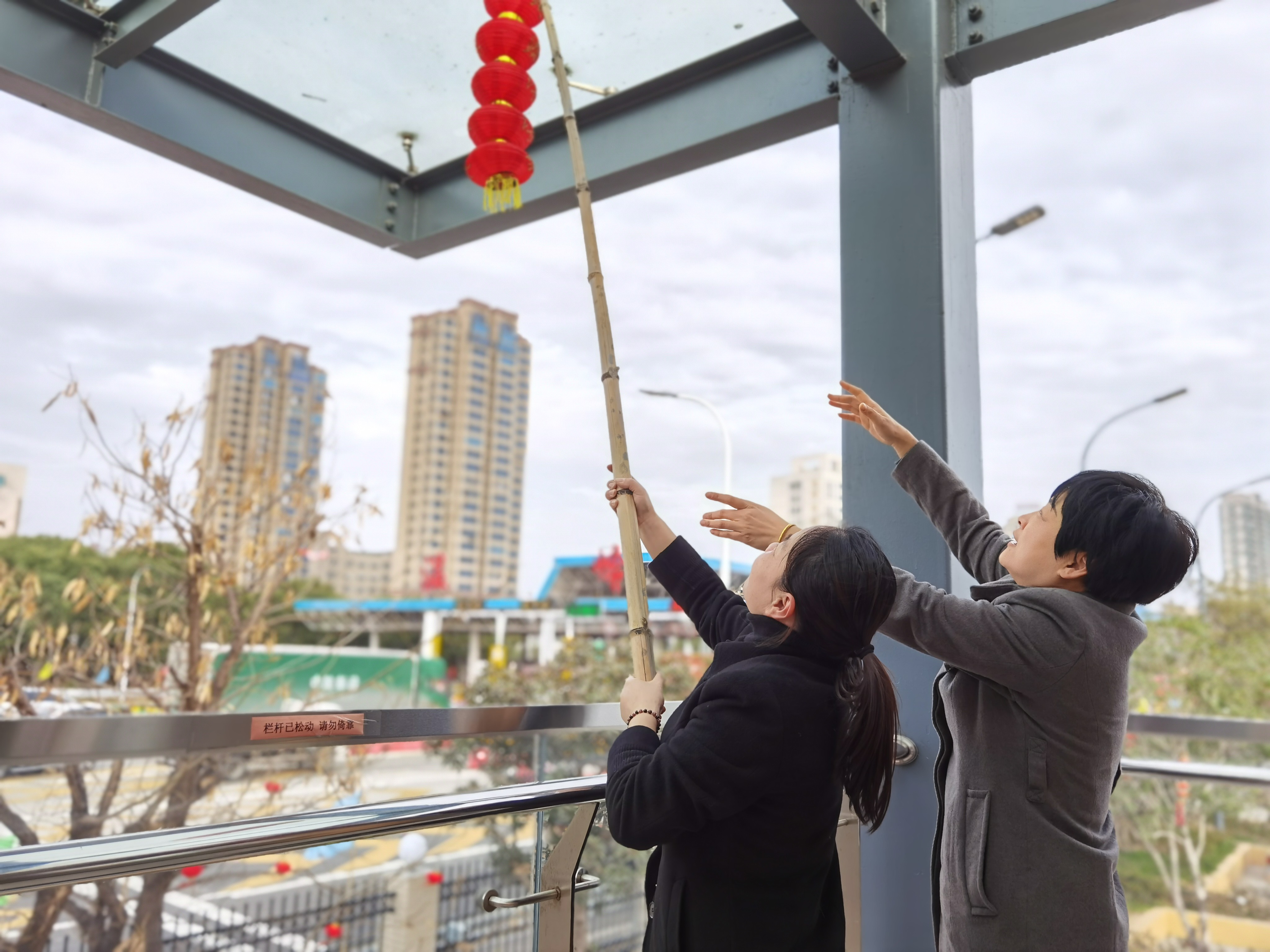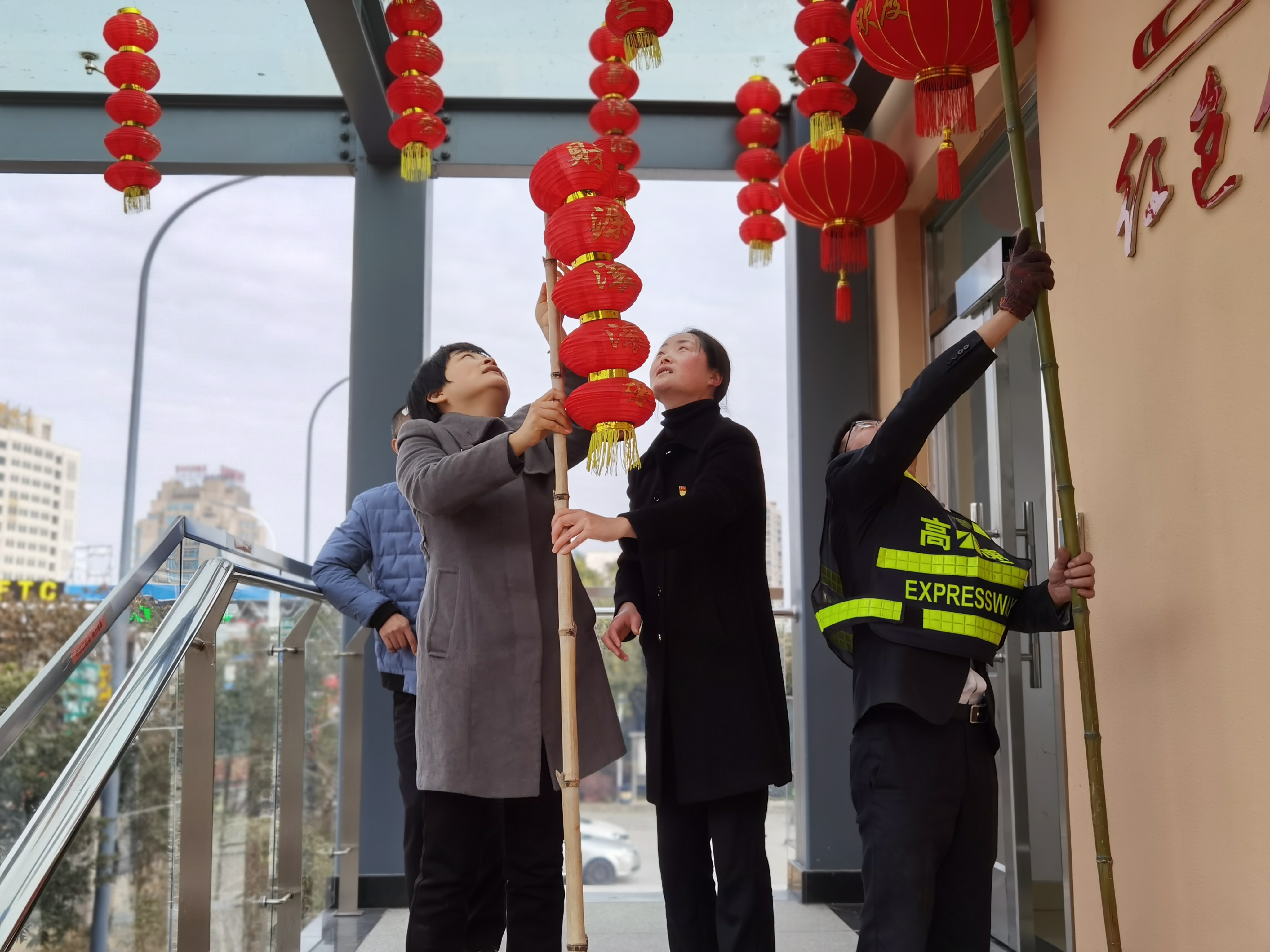 大家分工合作,搬梯子、遞春聯(lián)、貼膠帶、校正高低。在站所內(nèi)每個角落都掛上了紅彤彤的燈籠;收費(fèi)區(qū)域內(nèi)廣場兩邊的欄桿上扎著一面面彩旗。一幅幅精致喜慶的對聯(lián)、“福”字,一串串三角彩旗,一個個大紅燈籠把整個收費(fèi)站所點(diǎn)綴得處處洋溢著濃厚的節(jié)日氛圍,“年味”十足,讓在站員工和過往司乘朋友感受到新年的喜慶氛圍和“家”的溫暖。