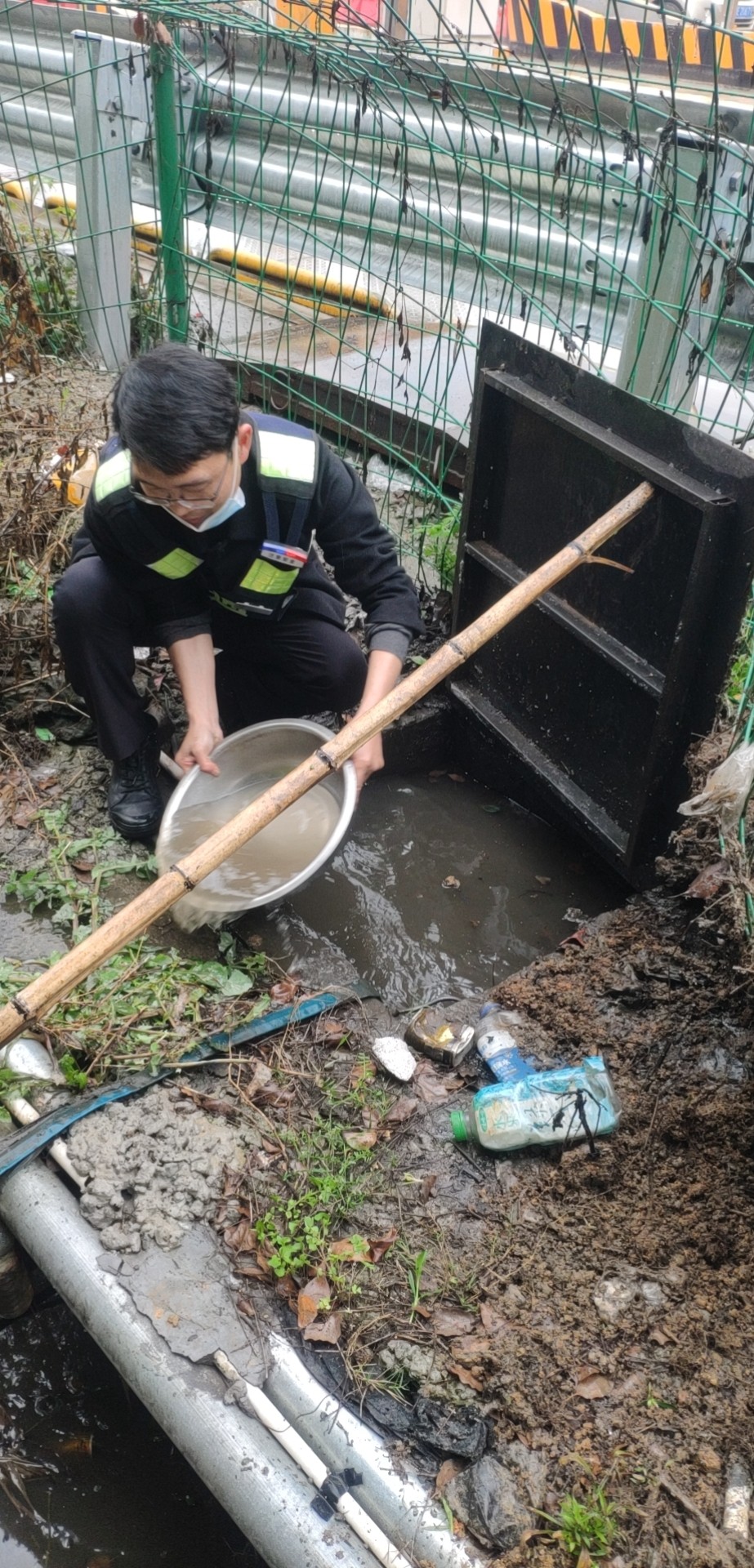 找出原因后,鄭星趕忙跑到所里取來一個水盆和一根木桿子。他用木桿支起排水坑上的蓋板,將坑里的積水一盆一盆地舀到旁邊的排水溝里。引導(dǎo)完車輛的林華平也過來協(xié)助鄭星。雖然此時外面下著雨,但他們?nèi)粵]顧上,只盼著舀水這個措施能夠有效,11號車道能夠早點恢復(fù)使用,進口秩序能夠早點恢復(fù)正常。 最后在鄭星和林華平的冒雨搶修下,排水坑里的水位總算有所下降,11號車道在關(guān)閉二十多分鐘后終于恢復(fù)使用,進口車輛也恢復(fù)暢通。 因地磅傳感器長期被雨水浸泡,可能還存在一些潛在問題。再者,排水坑里的水位雖有所下降,單憑人力實在無法在短時間內(nèi)排掉剩余積水。考慮到這些問題,班長在搶修過后又將情況匯報給了維養(yǎng)中心,維修人員后序針對地磅問題進一步展開排查和維修工作。 趙育辰