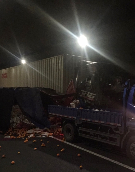 圖為事故現(xiàn)場 得知此情況,所負責人第一時間趕赴事故現(xiàn)場。事故就是命令!救援隊伍立即兵分三組,一組由駕駛員林通用巡邏車送傷者至臺州收費所出口,與前來救援的120救護車進行對接,一組由金志輝、宋勤滿在寧向南洞口卡口,一組由李海福所長、應錦清副所長在現(xiàn)場協(xié)調(diào)指揮,同時配合交警維護通行秩序,與交警一起對事故現(xiàn)場展開救援。 經(jīng)了解,由于藍色貨車超車道緩慢行駛,集裝箱與貨車發(fā)生車輛剮蹭追尾導致后方送桔貨車側(cè)翻。貨車上的桔子多半散落,給清障帶來一定的難度,管理所負責人、高速交警、清障人員、養(yǎng)護人員共同當起了“指揮員”、“搬運工”,全力清理事故現(xiàn)場。 16時36分,由于處理及時,措施得當,事故未造成大面積擁堵,道路恢復正常通行。 林玲