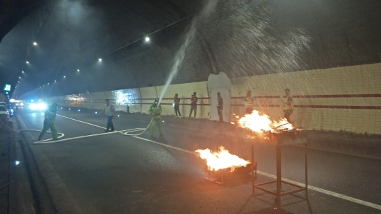 大溪嶺隧道所開展“隧道火災”演練 9月10日09:38,中控員發現大溪嶺隧道溫向入洞口800米處有火災,隨即通知隊長和臺州、溫州兩地監控中心,匯報火情。隨著一聲聲刺耳的警笛聲,大溪嶺隧道火災演練開始了。