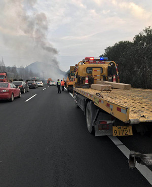 事態(tài)緊急,刻不容緩,清障車立即拉響警報(bào)預(yù)警,迅速提速超過(guò)事故車,指引該車轉(zhuǎn)入應(yīng)急車道避免二次事故。由于該車運(yùn)載易燃品,天氣晴好,火勢(shì)借東風(fēng)迅速變猛,無(wú)法直接現(xiàn)場(chǎng)救援,事故車駕駛員已經(jīng)手忙腳亂。施救中心工作人員立即緊急上報(bào)指揮中心請(qǐng)求消防車支援。中心“2+1+n” 快速應(yīng)急模式隨即馬上啟動(dòng),17:30分在中心待命的施救車也到達(dá)現(xiàn)場(chǎng)配合預(yù)警,保持事故現(xiàn)場(chǎng)另一車道暢通,不影響其他車輛安全通行。 17:40分消防車到達(dá)現(xiàn)場(chǎng)滅火,18:15火滅,清障車帶事故車離開(kāi)現(xiàn)場(chǎng)。從發(fā)現(xiàn)到處置完畢僅1小時(shí),無(wú)人員傷亡,高速公路也一直保持安全暢通。 童軍偉