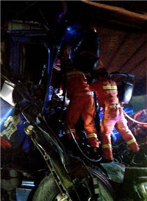 5分鐘后,兩輛紅藍(lán)警燈閃爍的施救車迅速飛至現(xiàn)場。此時現(xiàn)場多車損毀嚴(yán)重,尤其最后一輛大貨車駕駛室嚴(yán)重變形,司機受傷,胸部以下被車頭卡住無法動彈,血水從門縫流出,現(xiàn)有設(shè)備無法有效救援,也無法知道有無生命危險。