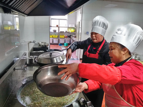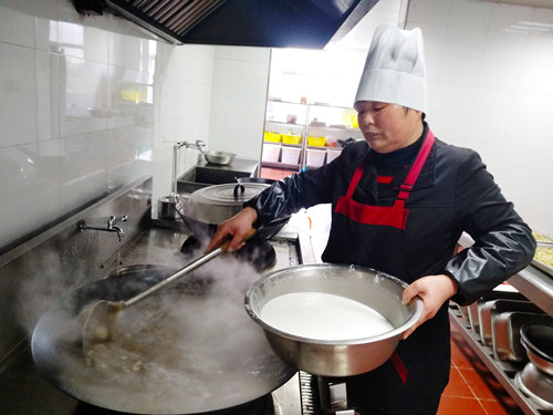 浸了一夜的早米,用石磨磨成米漿,細膩而幼滑,被靜置在盆里。“一般都用米粉泡水,口感粗糙,而且吃起來沒有香頭。”利花一邊說,一邊將香腸切碎與豆腐、冬筍、胡蘿卜、芹菜、香菇、蠶豆瓣翻炒著。旁邊的大鍋里,長長的豆面在骨頭湯里翻滾著,像一棵棵舞蹈的海草。徐徐倒入的米漿,被不停地攪拌,“要是粘到鍋,就會有焦糊味,這鍋羹就算廢了。”米漿好像不夠,利花有些懊惱,“要是在家里,米漿都會多準備一些,不夠就隨手添,我?guī)У竭@里就這些,也沒得加了。”就叫在一邊做幫手的妹妹寶花用面粉和山粉(也就是番薯粉)摻水拌起來,倒入鍋里,湯漸漸濃稠起來,倒入之前炒好的配料,加上切得細細的綠綠的芥菜梗、芥菜葉、海蠣,鍋里不時冒起大泡,香氣四溢。 為照顧吃不慣糟羹的同事,食堂還準備了一鍋甜的山粉糊。來自臺州各縣市區(qū)的同事,按各自飲食習慣選擇了咸的或甜的。有說芹菜的味道蓋過了芥菜清香的,有說沒有加入芋頭口感不夠糊的,但撲鼻的香氣和濃厚豐富的口感立刻讓人忘了挑剔。對我來說,碧綠的芥菜葉和白胖的海蠣肉是整碗羹的顏值擔當和靈魂所在。 每個元宵節(jié),對于在崗的同事們是沒有花燈可看、沒有燈謎可猜的,也不能與家人聚在一起吃羹。車道上此刻正是流量高峰期,大家匆匆吃完,都要趕著上崗。食堂大姐把多出的糟羹和山粉糊放進蒸飯鍋保溫,叮囑大家下班后再來吃點,這個吃了不扛餓。此時,除了食物最能體現(xiàn)節(jié)日氣氛外,還有那一份特意為你留著的溫熱更讓人感動。 鄭瑛芝