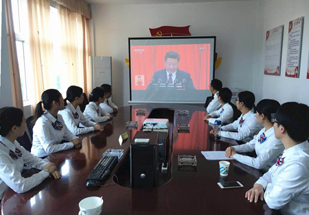 圖為大樓干部職工收看大會現場 習近平以生動、富有感染力的語言詳細講述了過去五年的工作和歷史性變革,新時代中國共產黨的歷史使命,新時代中國特色社會主義思想和基本方略這三大板塊內容,鼓舞全體中華兒女不忘初心,牢記使命,號召全國上下不斷奮進,高舉中國特色社會主義偉大旗幟,凝聚起同心共筑中國夢的磅礴力量,實現中華民族偉大復興的宏偉目標。