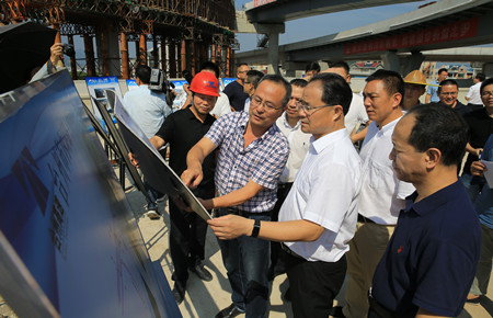 圖為市委書記王昌榮在6#立交查看工程進(jìn)度展板